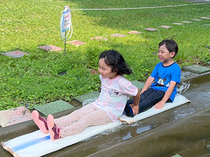 午後は、キャンプ前から子ども達がとても楽しみにしていたネイチャープログラムの「ブルーシートスライダー」! ネイチャープログラムリーダーお手製の「さるボート」に石鹸水をつけて、座って乗って滑ります。最初は少し怖がっていた子も、いざ滑り始めると「もう1回!」と何度も何度も挑戦し、大はしゃぎでした。うつ伏せ、友だちと連結などいろいろな滑り方を経験し、全身びしょぬれになるまで思いきり楽しむ姿がありました。