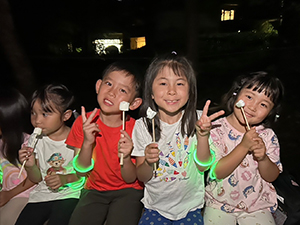 夜のお楽しみ会は、みんなで楽しみにしていた「キャンプファイヤー」。 火を囲む前にはみんなで手を繋ぎ、「チクサクコール」で気合いを入れました。先生の合図で呪文「ビスタ!」を唱えると、勢いよく火があがり、大きな歓声があがりました。 そのあとは、火を囲んでお礼拝をしたり、ダンス♪タタロチカを踊ったり、花火、焼きマシュマロをしたりと、夜ならではの特別なひとときをみんなで楽しみました。
