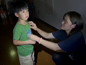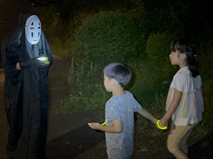 ロッジまで戻る帰り道は「肝試し」。 腕にライトを巻き付け、先生たちがかわいい、へんてこ、こわい格好に変装している道を通りながらロッジを目指します。はじめは怖くて涙が出てしまう子もいましたが、おともだちと励まし合いながら、最後まであきらめずに進むことができました。無事ゴールした後は、お菓子のご褒美をもらい、ほっとした表情を見せていました。