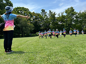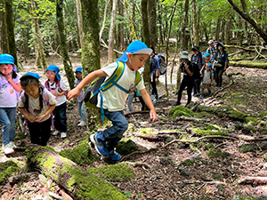 7月9日(2日目)の朝は、富士山のふもとの森を散策する「ふじさんぽ」へ出かけました。 静かな森の中で耳をすませて鳥の声や風の音を感じたり、丸太渡りをしたり、忍者のように木々の間を駆け抜けたり、洞窟の中を探検したりと普段なかなか味わえない自然の中で、五感を使ってのびのびと体を動かし、いきいきとした表情で楽しんでいました。