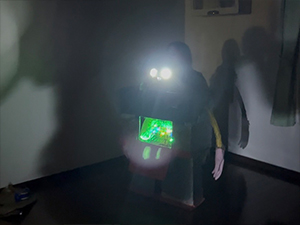 夜のお楽しみ会は、子どもたちがずっと楽しみにしていた「けん、くみ、ひろしのロビン探しとゆりぐみロビンのハート探しごっこ」。 キャンプ前から手紙のやりとりをしていたけん・くみ・ひろしからのメッセージを手がかりに、いよいよゆりぐみロビンのハート探しに向かおうとしたその時…。 なんと、ゆりぐみロビンがおそうじロボット(絵本に登場するロボット)にやられてしまい、体がバラバラになってしまった手紙が届きました。子どもたちは、ゆりぐみロビンからの手紙を読みながら、みんなと協力してゆりぐみロビンの体とハートのかけらを探し始めました。